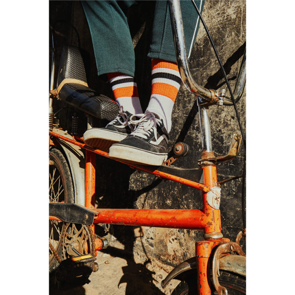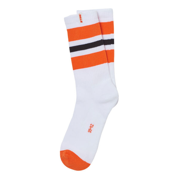 Çorape super moderne në ngjyrë të bardhë, me shirita portokalli/të zinj, për të siguruar një pamje konfidente dhe me stil.