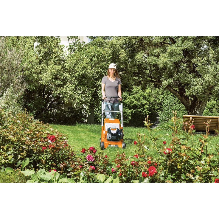 Korrëse bari me benzinë, kompakte, e fortë, me gjerësi prerjeje 43 cm për lëndina me sipërfaqe mesatare. Me përshtatje qendrore të lartësisë së prerjes, dorezë jo të palosshme dhe të rregullueshme në tre nivele lartësie dhe drejtim me një marsh për punë të rehatshme dhe efikase. Përfshin një kosh grumbullues të barit prej 60 litrash dhe treguesin e nivelit të mbushjes së tij.